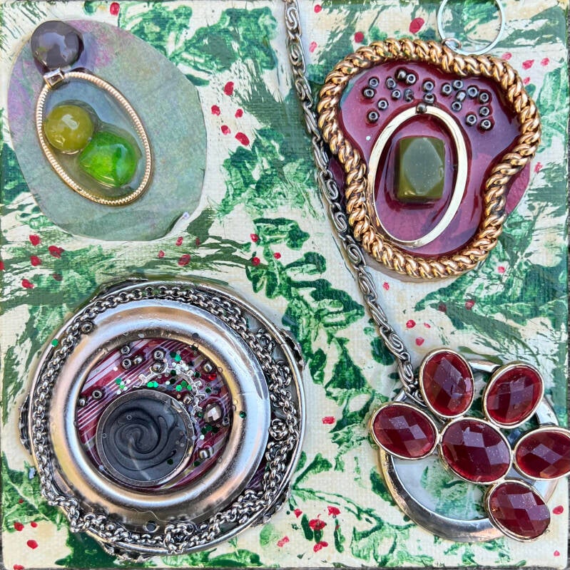 One Ornament 2, Acrylic Mixed Media Assemblage on Gallery Style Canvas, 4"X4", 2022